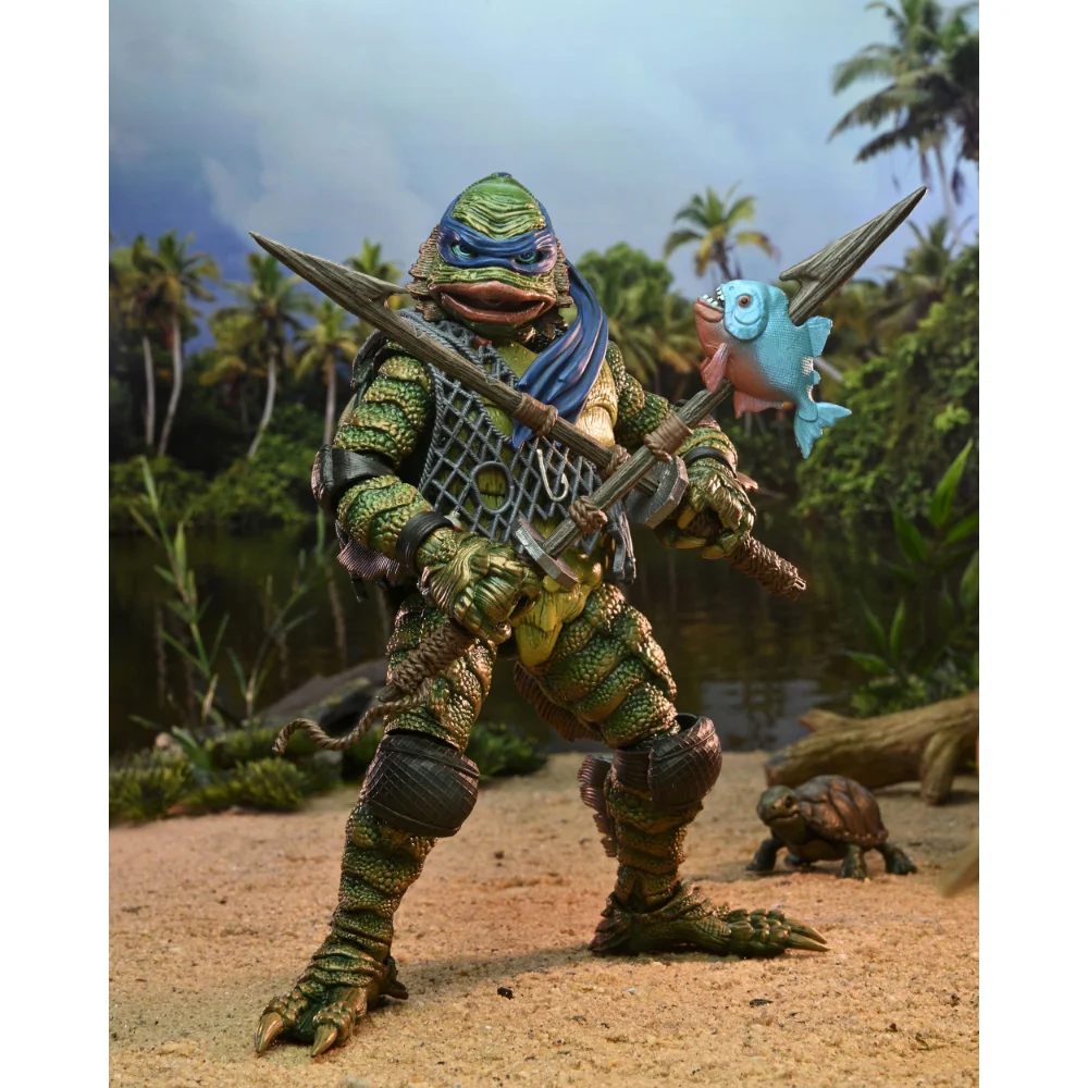 Die voll bewegliche Leonardo as the Creature TMNT Figur enthält zwei Harpunen-Katanas (eine mit Fisch), eine Schildkröte als Haustier, ansteckbare Handgelenkknochen und austauschbare Hände. Sie wird in einer sammlerfreundlichen Fensterbox mit einer Klappe zum Öffnen geliefert, die eine völlig neue Illustration von Daniel Horne zeigt.